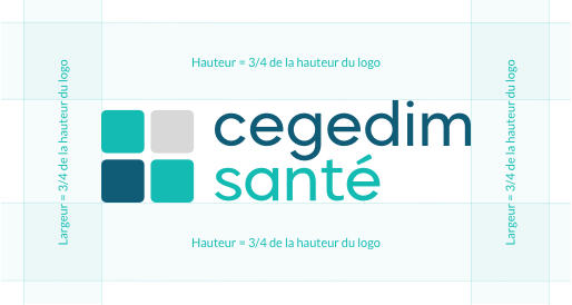 La zone de protection est destinée à protéger la lisibilité du logotype. Le logo Cegedim Santé peut être disposé librement en respectant cette zone de protection. L’espace minimum est représenté par la hauteur et la largeur du «e», et correspond aux 3/4 de la hauteur du logo Cegedim Santé. Aucun élément (image ou texte) ne doit apparaitre dans cette zone).